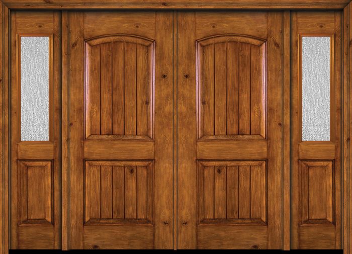 WDMA 84x80 Door (7ft by 6ft8in) Exterior Knotty Alder Alder Rustic V-Grooved Panel Double Entry Door Sidelights Rain Glass