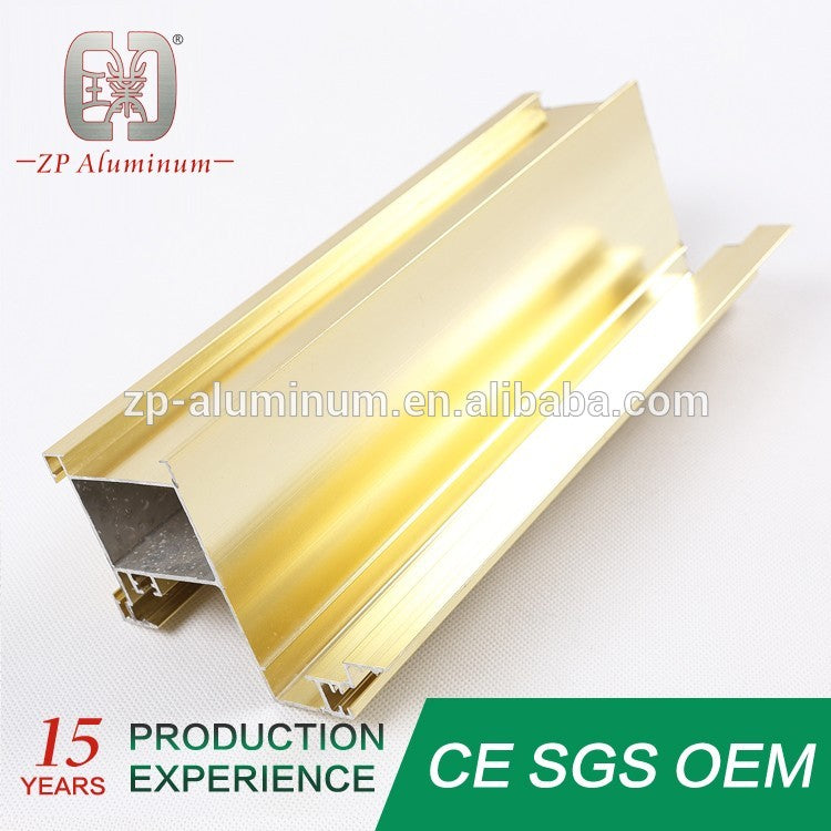 custom door and window aluminum extrusion Specification:  ZP ALUMINUM Grade and Temper 6063 6061 6060 T5 (T6)  7000 series Thickness 0.4--50m Cross-section 8--650mm Surface Treatment Anodizing,Powder Coating,Wood Grain,Electrophoreses, Mill finish,polisehed and brushed  Advantages 1.Good quality in material; 2. Excellent surface finish 3. Competitive price Standard GB/75237-2004,Q/320281/PDWD-2008 Certificate  1) ISO9001-2008/ISO 9001:2008; 2) CQM Certification; 3) SGS, CE, BV, JIS, AS, available Guarantee Surface color can be stable for 10~20 years indoor using. Settlement Terms Charge by final actual weight or by drawing theoretical weight        Color: Anodizing: Silver, bronze, champagne, titanium, nickel, golden yellow, etc. Anodizing thickness is up to 25um. PVDF Coating: White, black, bronze, grey, green, Powder coating thickness is more than 60um. Wood Grain 1. Italian MENPHIS transfer printing paper. 2. AKZO NOBEL INTERPON D10: Australia ceder, Bush cherry,Chest nut, Jarrah I, Jarrah II, Western red ceder, etc. 3. AKZO NOBEL INTERPON D34: Bush wood, Western red,Jarrah, Snow gum,etc. Electrophoresis:  Silver, nickel, golden yellow, black, champagne, etc Polishing  Silver, nickel, golden yellow, black, etc Brushing:...