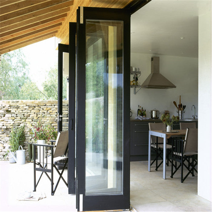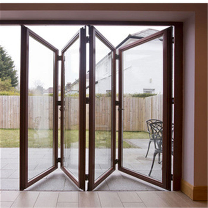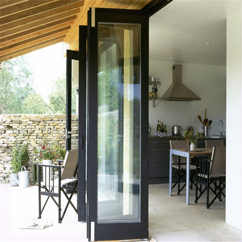 Product Description outdoor soundproof veranda bifold doors bi folding glass patio screen door   Specification    Aluminum  Profile  Material: aluminum alloy 6063-T5  Color: gray/champagne color/wood grain/white/black or other customized colors  Thickness: 1.1mm/1.2mm/1.4mm/1.5mm/1.6mm/1.8mm/2.0mm/2.5mm, etc Surface finish  A. powder coating  B. electrophoresis  C. heat transfer for wood grain  D. PVDF coating Glazing  Material : single glass, double glass, tempered glass, floating glass,  insulating glass, reflective glass, laminated glass, low-E glass, smart glass  Color : clear / gray / green / frosted, etc  Single : 4mm to 12mm   Double : 4mm+7A/15A/20A+4mm, 5mm+12A/15A/16A/27A+5mm, etc  Triple : 5mm+6A+5mm+6A+5mm,etc Sealing  EPDM rubber and silicone sealant Hardware  SIEGENIA, HOPPE, HOPO, Kinlong, Chinese brand or German brand, etc Package  Protection foam+heat contracted plastic film/carton/wooden packing/ Metal pallet or   depending on clients' special requirements   Details      Glass option      Aluminum...