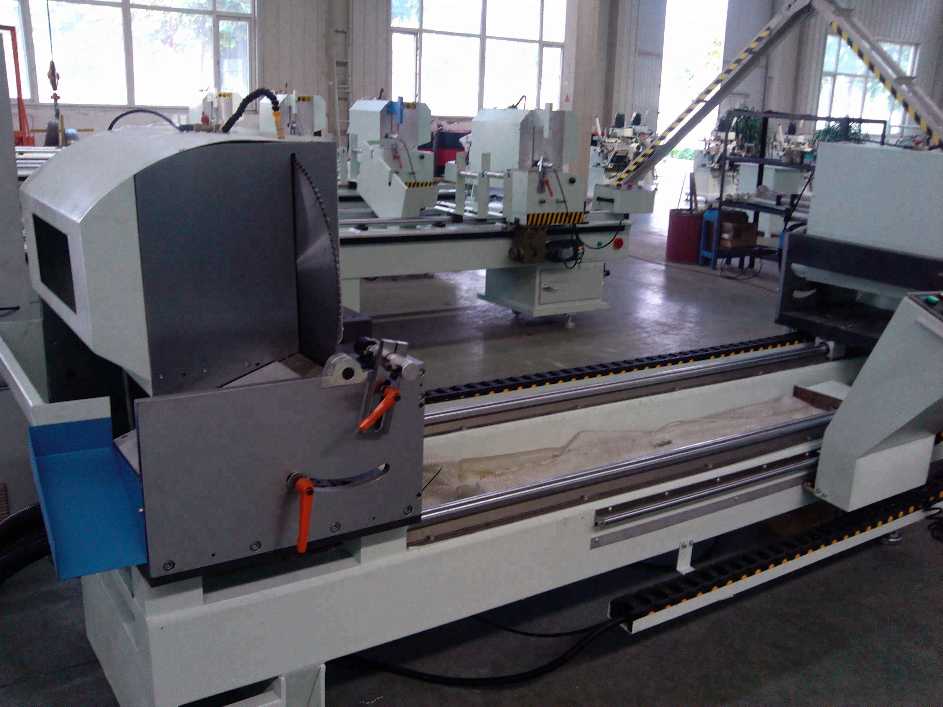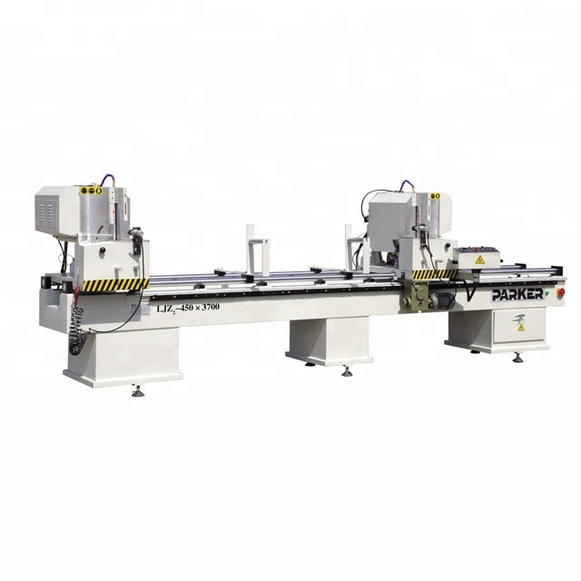 machines for making upvc windows / double head cutting saw machine Model: LJZ2-450×3700 Features: Imported carbide saw blade give accurate processing and high endurance. Saw blade rotate smoothly due to high accuracy main spindle. Uniform speed feeding and smooth motion due to air-hydraulic damping cylinder. Used for cutting aluminium at -45°,90°and 45° One time processing can cut off the required length. The safety devices designed specially clamp the devices when power is cut off suddenly. So the safety of operators is assured. Parameters: Other Upvc & Aluminium Window Door Machines: Factory: Samples: Exhibitions: Factories of Customers: Customers Visit: Parker Service Team: Packing &...